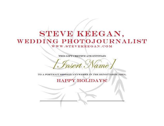 You will get a customized gift certificate to give as a gift so they have something to open on Christmas day. This offer is only available for photo shoots in the Reno/Tahoe area. All gift certificates will be marked for authenticity.